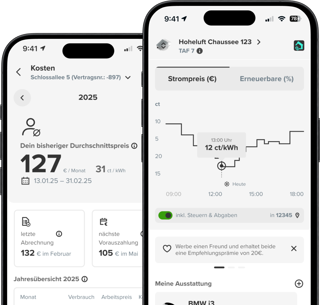 In der App stellst Du ein, bis wann Dein Auto welchen Akkustand erreichen soll. In diesem Zeitraum laden wir Dein Auto automatisch zu den günstigsten Preisen. Zusätzlich kannst Du Verbrauch und Kosten Deines Haushalts jederzeit einsehen.